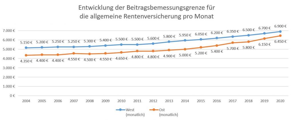Die BBG erhöht sich kontinuierlich. Für den Bereich der gesetzlichen Rentenversicherung (allgemeine Rentenversicherung) ergibt sich für die Abrechnungsverbände Ost und West getrennt folgende Entwicklung: